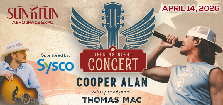 Join us for an unforgettable Opening Day Concert on Tuesday, April 14, 2026, at 6 PM, as Cooper Alan and Thomas Mac take the stage on the Warbird Ramp at the SUN ‘n FUN Aerospace Expo!